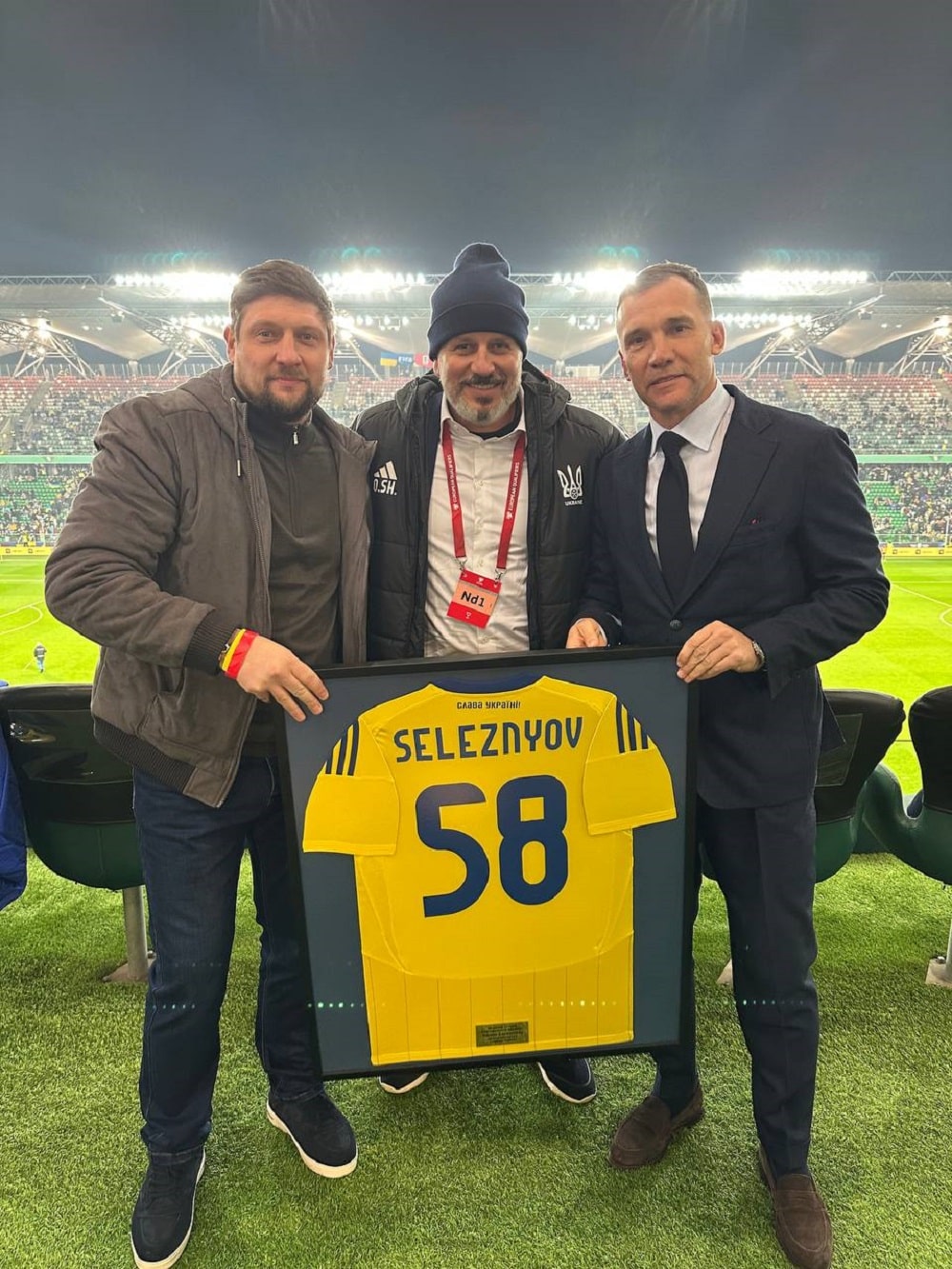 Президент УАФ Андрій Шевченко й віцепрезидент УАФ Олександр Шевченко на стадіоні «Легія» у Варшаві вручили ексгравцям національної команди пам’ятні футболки, на яких закарбувалася кількість матчів кожного у збірній України.