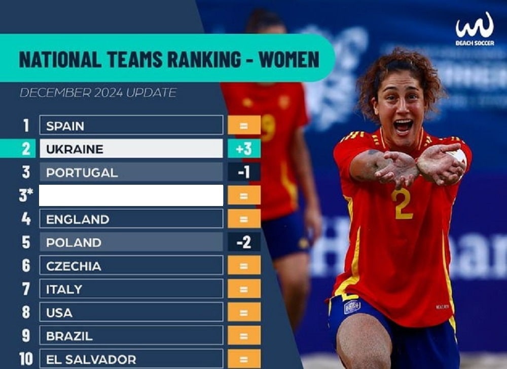 Як повідомляє офіційний сайт BSWW, жіноча збірна України з пляжного футболу згідно з грудневим реєстром займає у світовому рейтингу BSWW другий рядок, поступаючись лише Іспанії. Українки мають в активі 891,25 бала й відстають від іспанських конкуренток на 1033,75 очка. Позиція наших дівчат є абсолютним рекордом для українського пляжного футболу. Порівняно з попереднім рейтингом підопічні Юрія Клименка піднялися на три сходинки.