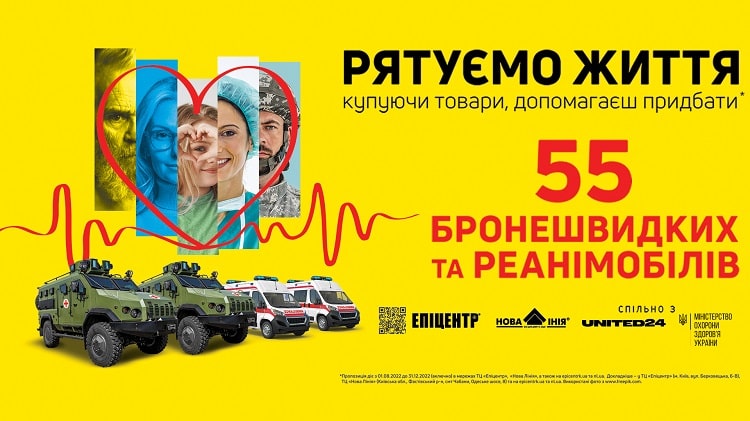 Благодійна ініціатива полягає в тому, що з кожної покупки в мережі ТЦ «Епіцентр» кошти будуть спрямовуватися на закупівлю 55-ти бронешвидких та реанімобілів. Ініціатива реалізується за підтримки Міністерства охорони здоров'я України. Компанія «Епіцентр» закупить та передасть нові сучасні автомобілі центрам екстреної медичної допомоги. Нагадаємо, 10 сучасних реанімобілів типу С компанія вже профінансувала через платформу UNITED 24 (https://u24.gov.ua/uk), і найближчим часом вони будуть допомагати рятувати життя людей у різних регіонах нашої країни.