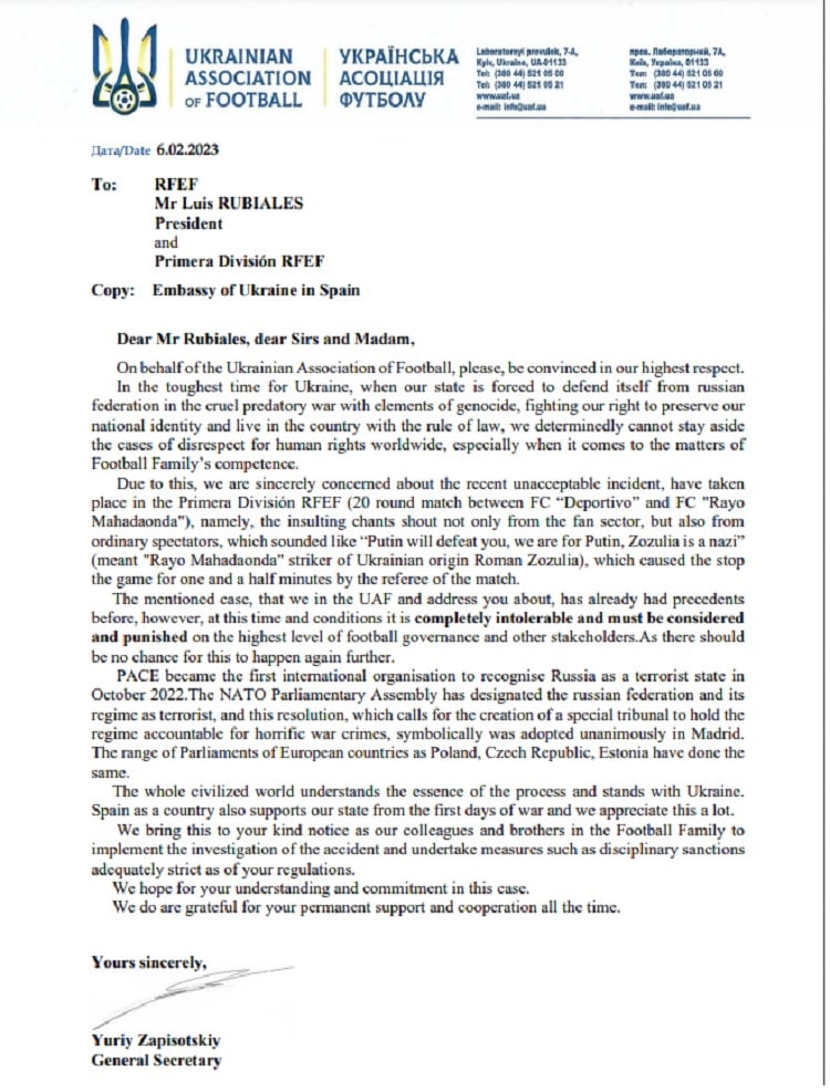 Українська асоціація футболу надіслала лист на адресу президента Королівської іспанської футбольної федерації Луїса Рубіалеса з проханням провести розслідування інциденту, що стався в матчі між ФК «Депортіво» і ФК «Райо Махадаонда», та вжити заходів.