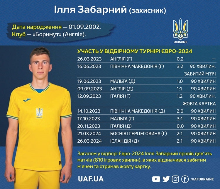 У відборі Євро-2024 захисник англійського «Борнмута» Ілля Забарний зіграв дев’ять матчів, забив один м’яч та отримав одну жовту картку.