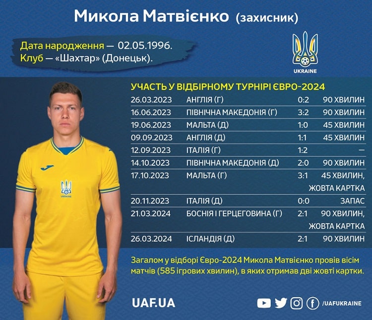 У відборі Євро-2024 захисник «Шахтаря» Микола Матвієнко зіграв вісім матчів, в яких отримав дві жовті картки.