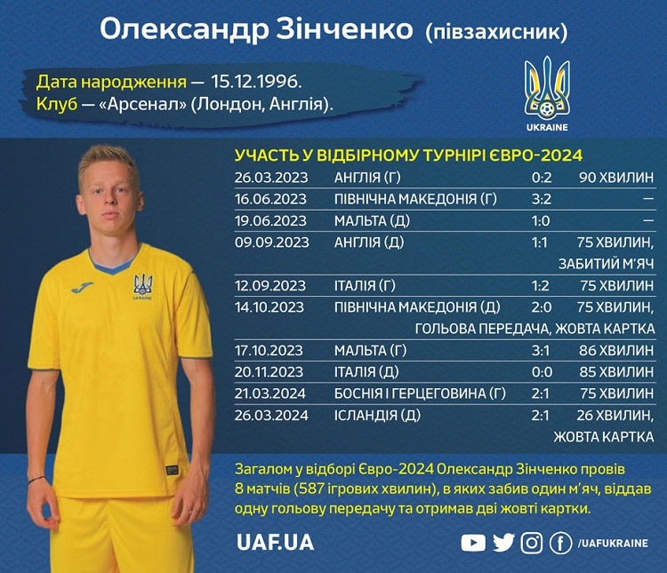 У відборі Євро-2024 півзахисник лондонського «Арсеналу» Олександр Зінченко зіграв вісім матчів, в яких відзначився одним голом, однією результативною передачею та отримав дві жовті картки.