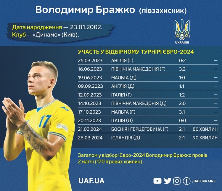 У відборі Євро-2024 півзахисник київського «Динамо» Володимир Бражко зіграв два матчі.