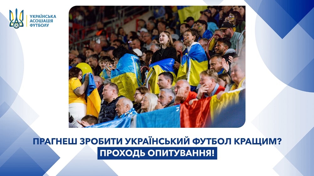 Українська асоціація футболу запрошує вас пройти коротке онлайн-опитування. Ваші відповіді допоможуть нам краще зрозуміти потреби вболівальників і зробити футбол іще доступнішим, яскравішим і ближчим для кожного.